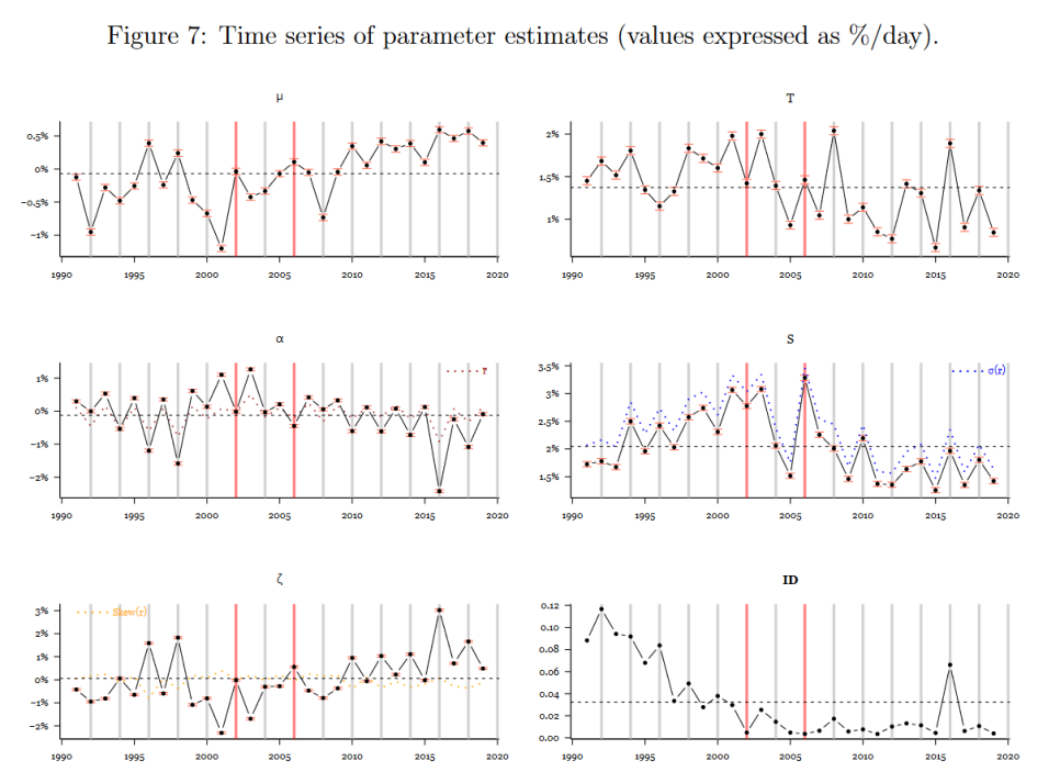 시장에 대한 기대충족을 나타내는 정보인, ζ 의 변동폭을 살펴보면 흥미롭다. 이 정보는 시장이 장기관점에서 평균회귀가 명확하지 않다는 것을 보여주고 있다. ζ가 + 값일때, - 왜도가 나타나고 그 반대도 동일하게 발생한다.