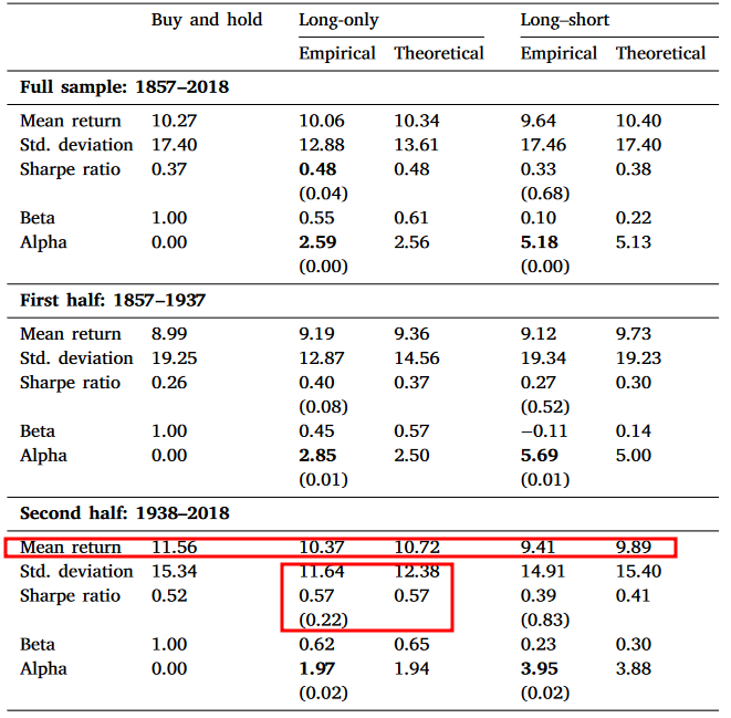 실증 데이터와 별도로 이론적 모델로 시뮬레이션을 했을때, 비교를 해보면 다음의 표와 같은 숫자가 나온다. 좀 살펴보면 가장 아랬부문만 보면 될것이다. Buy and Hold는 계속 사서 보유할때이고, Long-only는 올라가는 상황에서만 투자하는 것이고, long-short은 사고 팔고를 한것이다. 즉, 1938~2018년의 데이터만 봐서는 Buy and hold가 수익율이 연평균 11.56이고 나머지는 10%내외이다. 또한 Risk인 SD는 Buy and hold가 더 크다. 그렇다보니. Long-only가 샤프비율이 높은 것으로 나왔다.