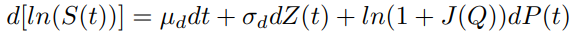 µd is the log-diffusion drift, σd is the volatility of the stock return and ln(1+J(Q)) is the log-return jump-amplitude with the a simple Poisson jump process dP(t) with jump rate λ and the process ensures that J(Q) > −1