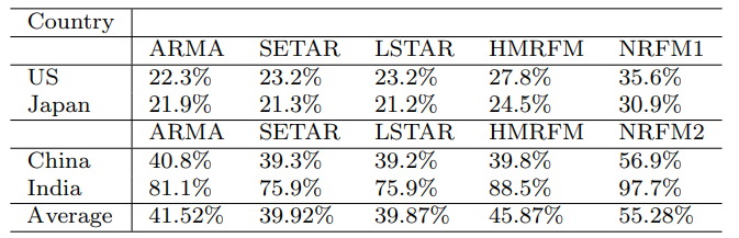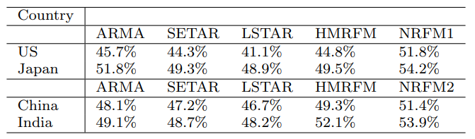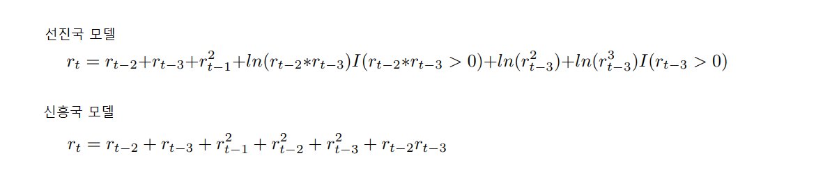 선진국과 신흥국모델을 설정할때 r = return값이고, r t-n은 lag값이다. 즉, 기존 수익율을 변수로 산정한 모델이기 때문에 단순하게 변수처리가 되었다고 볼수도 있다. 선진국 모델은 Nonlinear Return Forecasting Mode 1 (NRFM1), 신흥국모델은 Nonlinear Return Forecasting Mode 2(NRFM 2)로 명칭했다.