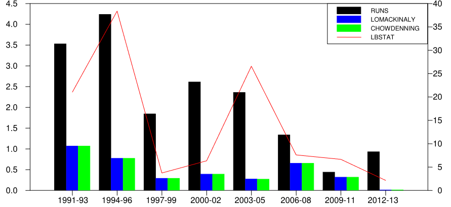 선형성에 대한 테스트를 확인해 보면 선형적 종속성에 대한 설명을 할수 있다. 아래 그림은 테스트 결과를 보여준다. LB테스트 통계(붉은 실선)은 1994–1996 and 2003–2005에 가장 높아졌다가 내려간다. Run TEst도 유사하다. 한편 Lo-MacKinlay and Chow-Denning statistics은 1994–1996, 1997–1999.에 크기가 크다. 즉 선형성으로 미래 기간을 예상하는데 선형성은 크게 의미가 없다. 특히 2008년 서브프라임 사태와 같은 외부적 충격을 전혀 반영되면 선형성은 전혀 작용하지 않는다.