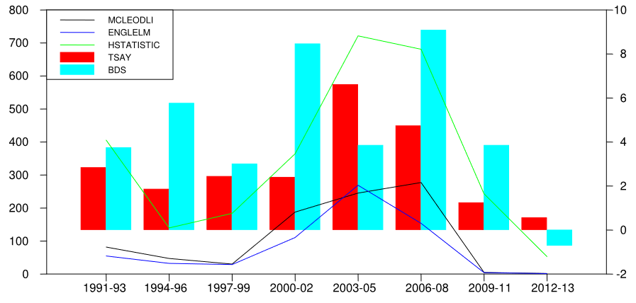 반면에, 비선형성은 어떨까? McLeod-Li의 트랜드는 003–2005 and 2006–2008 기간에 더 비선형 종속성에서 더 강한 현상이 보여지고 있다. Engle LM, Tsay, H and BDS test 통계에서도 2000년 까지 비선형적 종속성이 존재한다. . 반면에 비종속성 경향은 더 크게 보인다. 특히 2008년 서브프라임 사태와 글로벌 금융위기 상황에서의 종속성은 매우크게 나타난다.