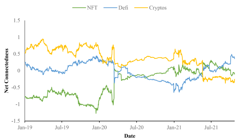 아래를 보면 각 자산별 연결성을 살펴본 것입니다. 가상화폐와 Defi 그리고 NFT가 개별적인 연결 강도를 살펴본 것이 아래의 그림입니다. 가상화폐는 당연히 위험 전이도가 높은 반면에, NFT 코인등은 상대적으로 낮은 위험 전이도가 존재합니다.