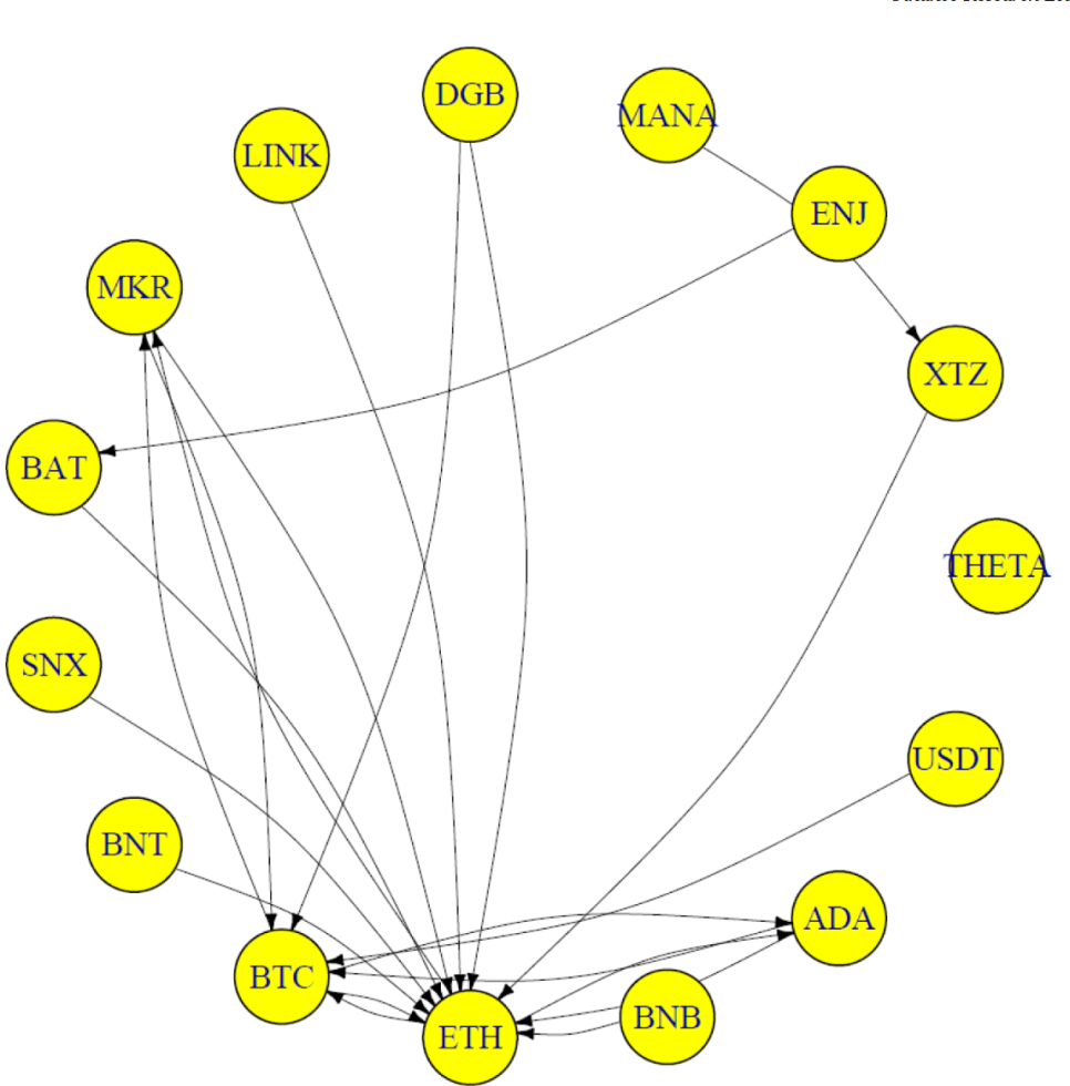 위의 네트워크는 중위값의 네트워크 리스크 전달 분포를 나타낸다. ( THETA (THETA), XTZ (TEZOS), ENJ (ENJIN COIN), MANA (DECENTRALAND), DGB (DIGIBYTE), LINK (CHAINLINK), MKR (MAKER), BAT (BASIC ATTENTION COIN), SNX (SYNTHETIX), BNT (BANCOR), BTC (BITCOIN), ETH (ETHEREUM), BNB (BINANCE COIN), ADA (CARDANO), and USDT (TETHER))
