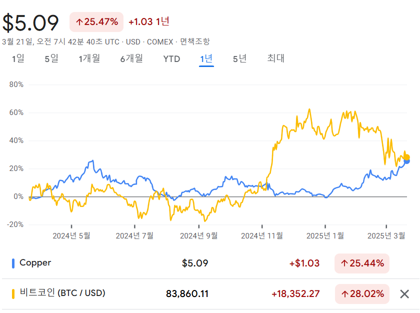 • 금의 안전자산 특성: 금은 안전자산으로 여겨지기 때문에, 금의 가격 변동이 비트코인의 투자 전망에 영향을 미치는 요소입니다. 반면, 구리는 산업용 금속으로, 글로벌 경제의 확장과 함께 강세를 보이는 경향이 있습니다.