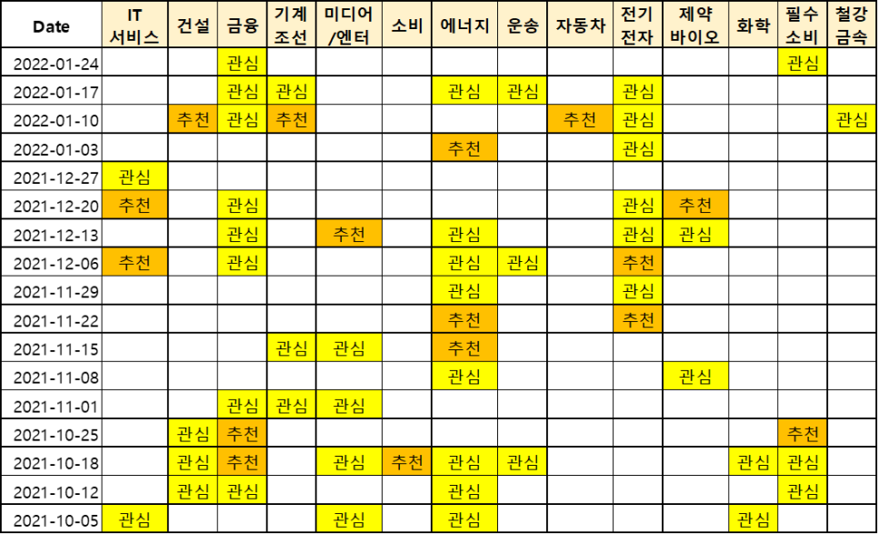 다음주 시장 추천 시그널을 보면 아이디어가 보이죠. 1) 추천섹터 시그널은 2주 연속 보이지 않네요. 2) 관심섹터 시그널은 더 줄어들었습니다. 시장이 보수화 되었따는 점입니다. 또한 시그널 상에는 관심 섹터가 줄어들면 단기적으로는 바닥이 왔다는 것을 나타냅니다.