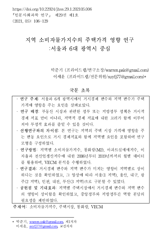 지역 소비자물가지수의 주택가격 영향 연구: 서울과 6대 광역시 중심 [KCI/인문사회과학연구, 2021]