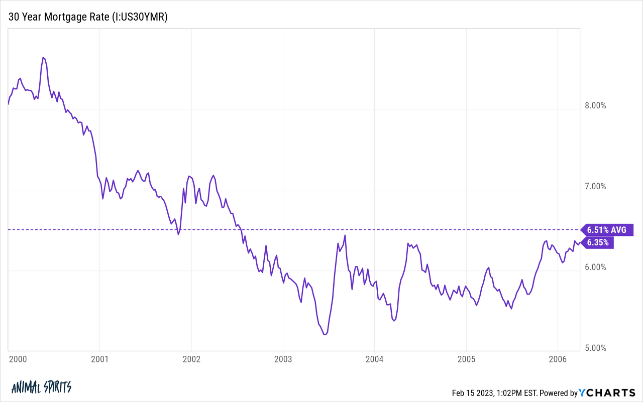 일본은 1990년대 이후 또 다른 거품을 피했지만 미국에서 기술 붐이 끝난 후 우리는 많은 시간을 낭비하지 않았습니다. 닷컴 거품이 터진 지 불과 몇 년 만에 주택 거품이 터졌습니다. 전국 주택 가격은 2000년부터 2006년 봄까지 85% 상승했습니다. 그 당시 모기지 금리는 평균 6.5%였으며 결코 5% 아래로 떨어지지 않았습니다.
