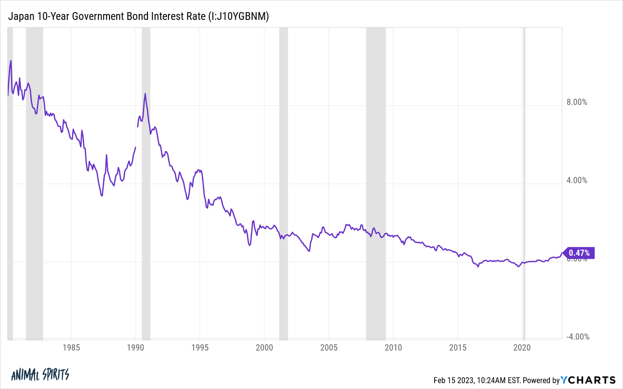 1980년대 일본 국채 금리는 평균 6.5%였다. 1990년 이후 평균 1.8%였습니다. 금세기 일본의 10년물 수익률은 평균 0.85%에 불과했습니다. 일본에서는 20년 이상 평균 금리가 1% 미만인 거품이 없었습니다