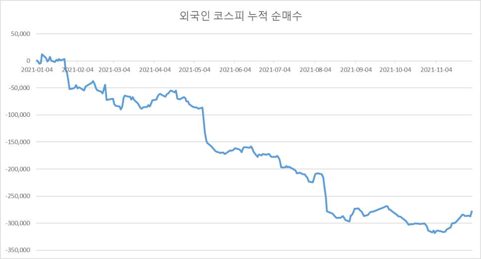 하지만 연간으로 보면, 외국인의 코스피는 누적으로 27조원을 팔았습니다. 최근에야 조금 샀을뿐이죠.