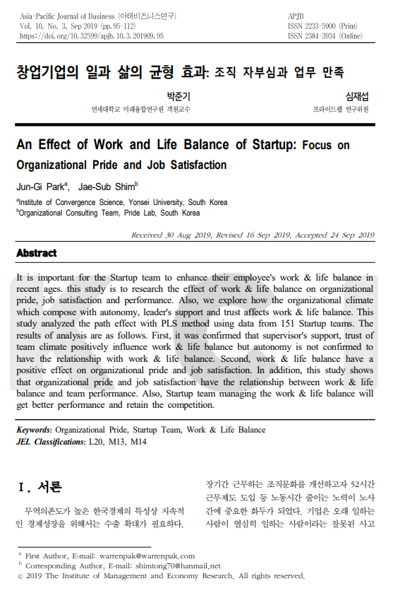 창업기업의 일과 삶의 균형 효과: 조직 자부심과 업무 만족 An Effect of Work and Life Balance of Startup: Focus on Organizational Pride and Job Satisfaction [KCI/아태비즈니스 연구/2019]